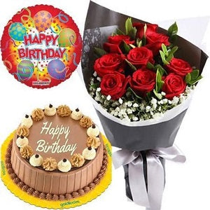 12 Red Roses Bouquet Arrangement with Round Mocha Dedication Cake and Birthday Balloon.