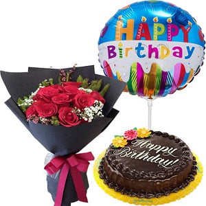 12 Red Roses Bouquet Arrangement with Round Chocolate Dedication Cake and Birthday Balloon.