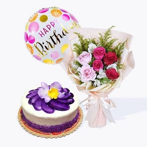 Half Dozen Red and Pink Roses Bouquet Arrangement with Ube Cake and Birthday Balloon.