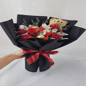 Chocolate Bouquet of 10 Ferrero Chocolates with 12 Red Roses and small brown bear.